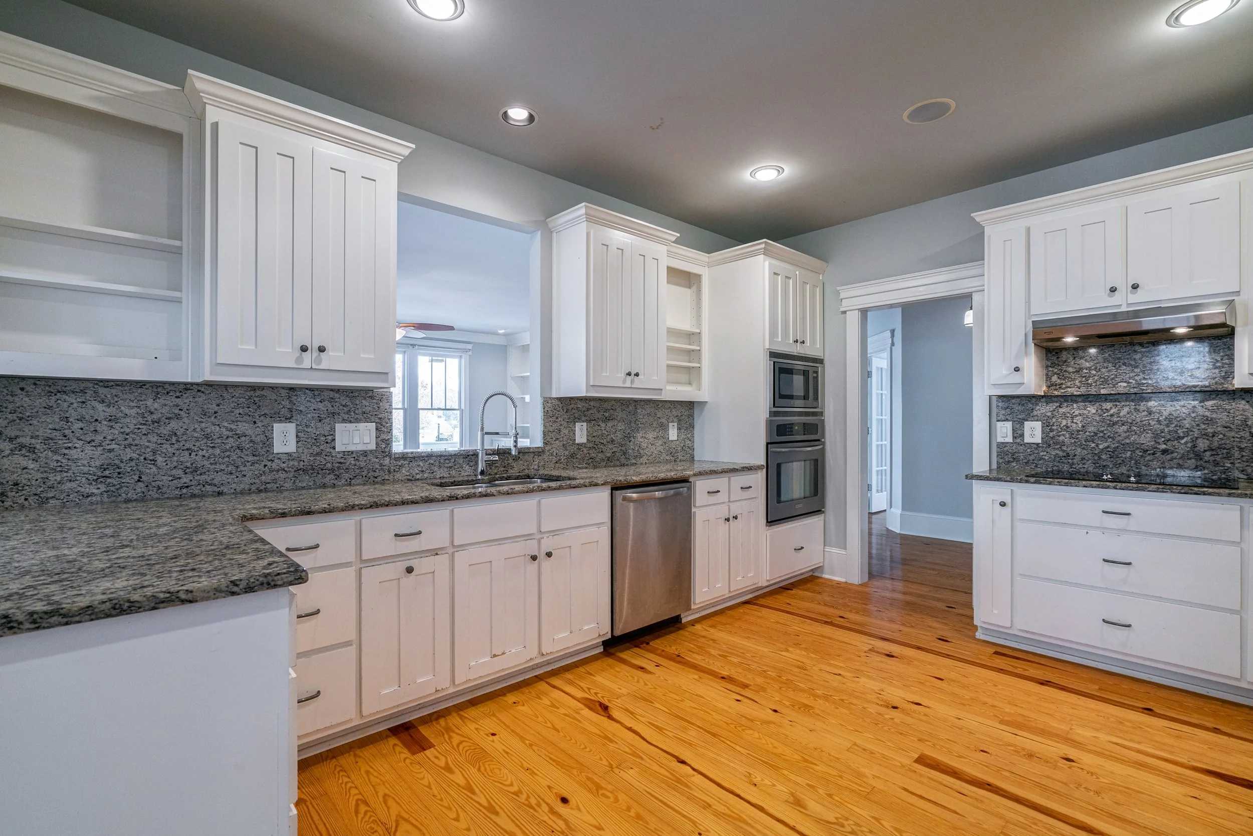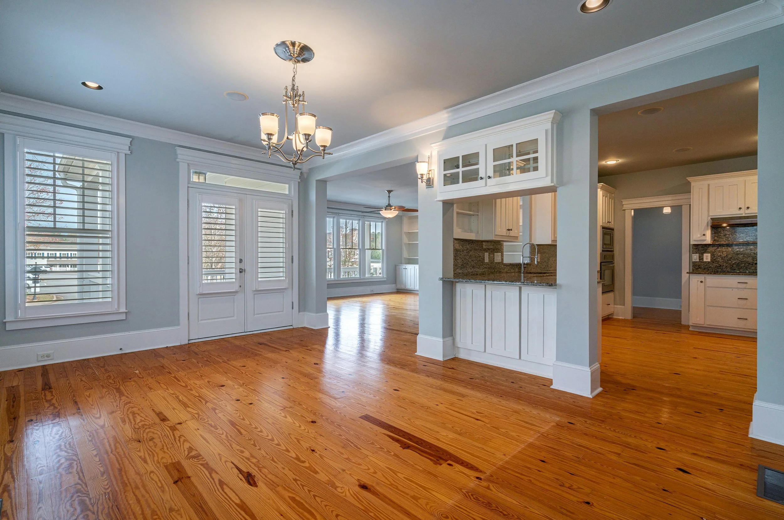 From the lanterned porch, guests are welcomed into an entry foyer streaming with natural light, which highlights the stunning heart of pine floors that extend throughout the entire first floor of this wonderful home. To the left of the entry is a first-floor bedroom with private access to the additional first-floor bathroom. This room is perfect for a first-floor office or for welcoming overnight guests.