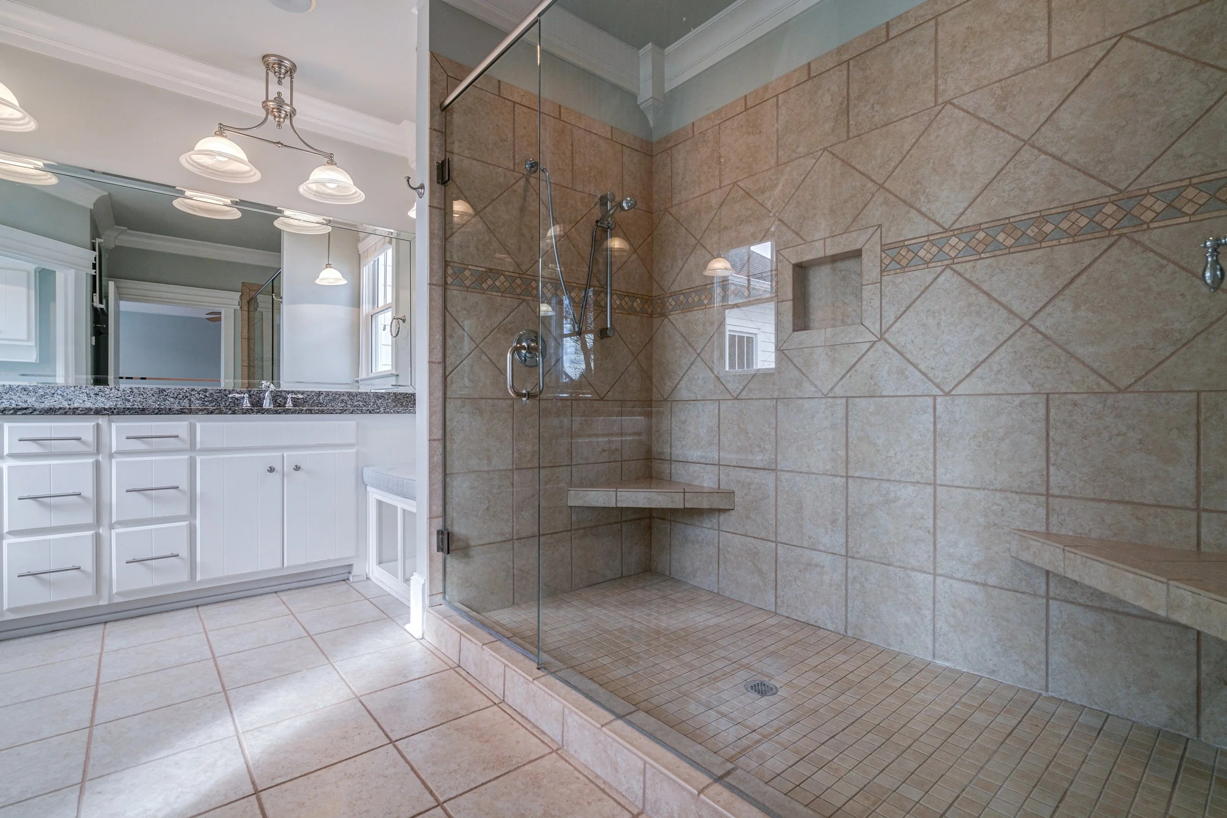 The owner’s suite of this home spans the entire back half of the house with a spacious bedroom featuring beautiful trim, heart of pine floors and plantation shutters that filter beautiful natural light into the room; a well-designed closet with a custom closet system that organizes the space; and a spa-like tiled bathroom with white, comfort height “his” and “her” vanities with stop tops, a large shower with bench seating, multiple shower heads, a frameless glass shower enclosure and a separate water closet.