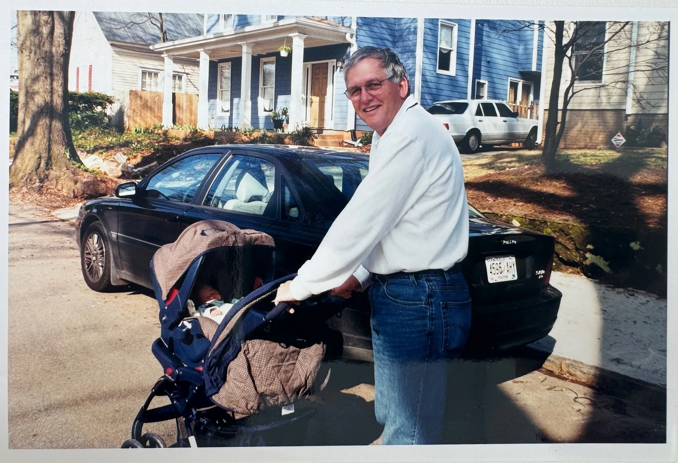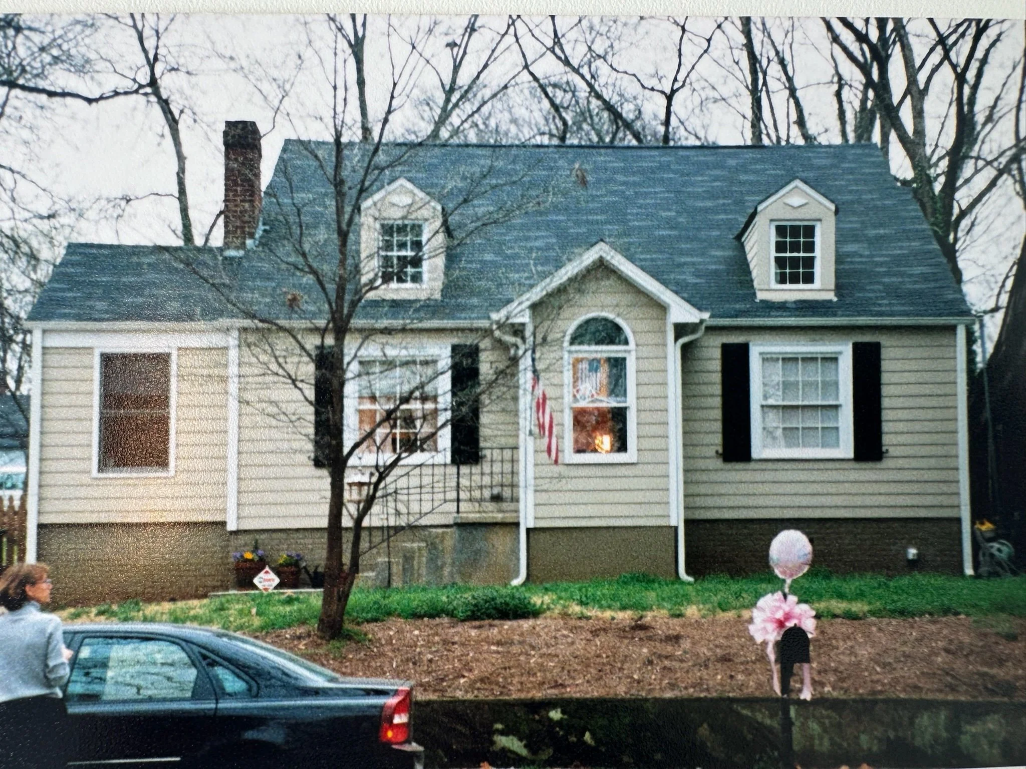 Ellie as a newborn being pushed by my father-in-law in front of the new construction house that we built next door to Cape Cod house.